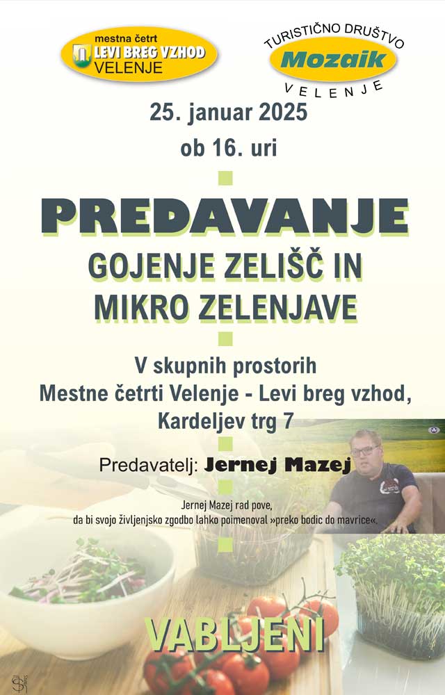 Vabljeni na predavanje s temo Gojenje zelišč in mikro zelenjave, ki bo 25. januarja 2025 ob 16. uri v prostorih Mestne četrti Velenje - Levi breg vzhod.