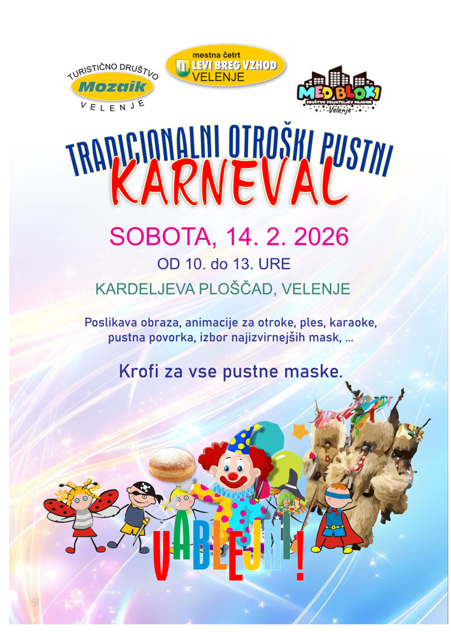S podporo članov DPM Med bloki Velenje bomo v soboto, 14. marca 2026, na Kardeljevi ploščadi pripravili TRADICIONALNI OTROŠKI PUSTNI KARNEVAL. Pričakujemo preko 500 pustnih mask in njihovih spremljevalcev od najmlajših do malo starejših.