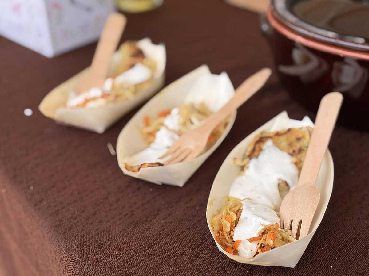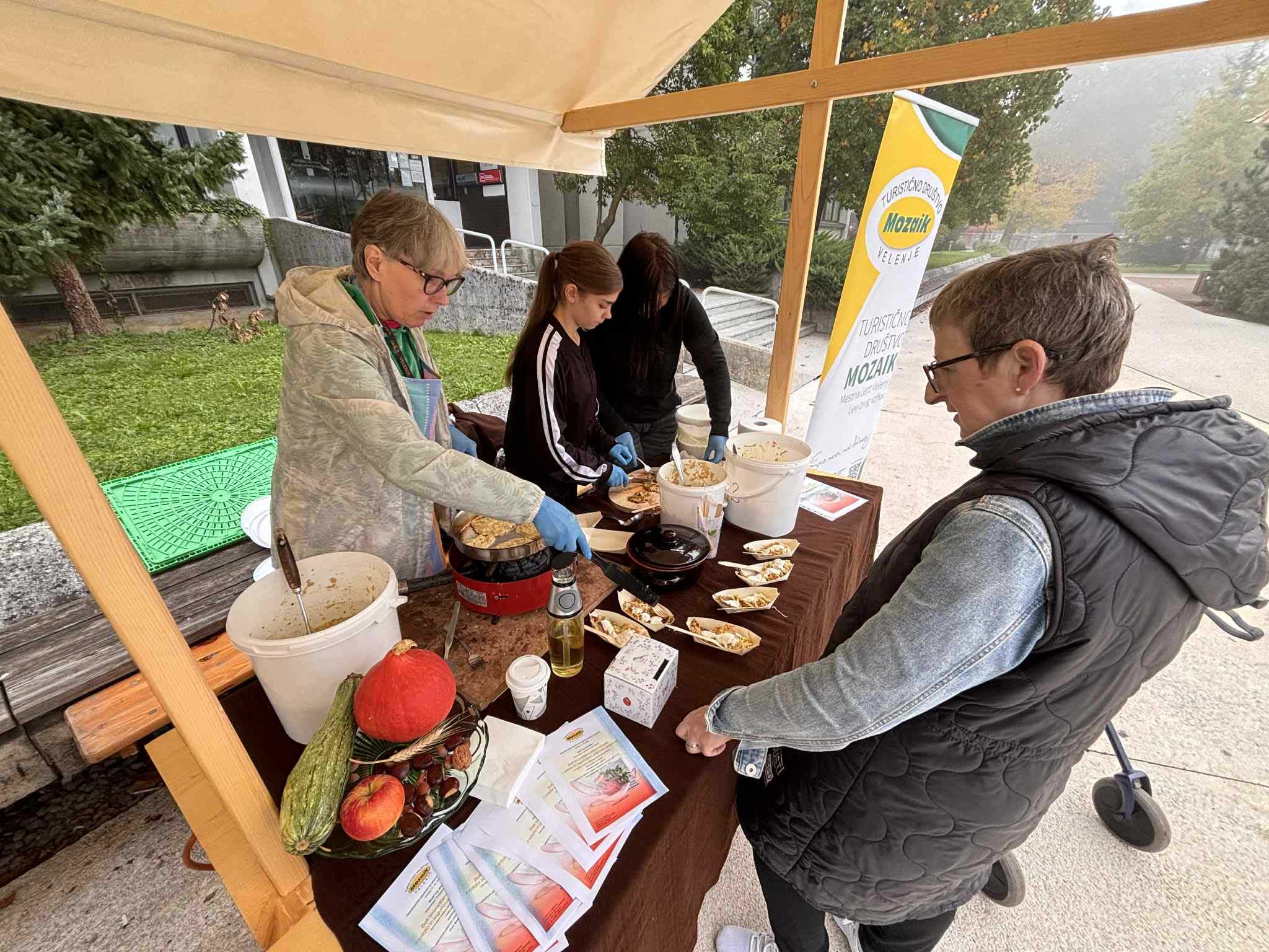 Na današnji sobotni tržnici je dišalo po krompirju, palačinkah, miškah, čaju, zeljni solati, bučnem olju, zeliščih in smehu ljudi. Ekipa TD Mozaik Velenje je s svojimi Zlatimi krompirjevimi zrezki z zeljno solato in jogurtovim zeliščnim prelivom navdušila obiskovalce — tako zelo, da smo vse na naši stojnici spekli in razdelili že ob pol enajstih dopoldne!