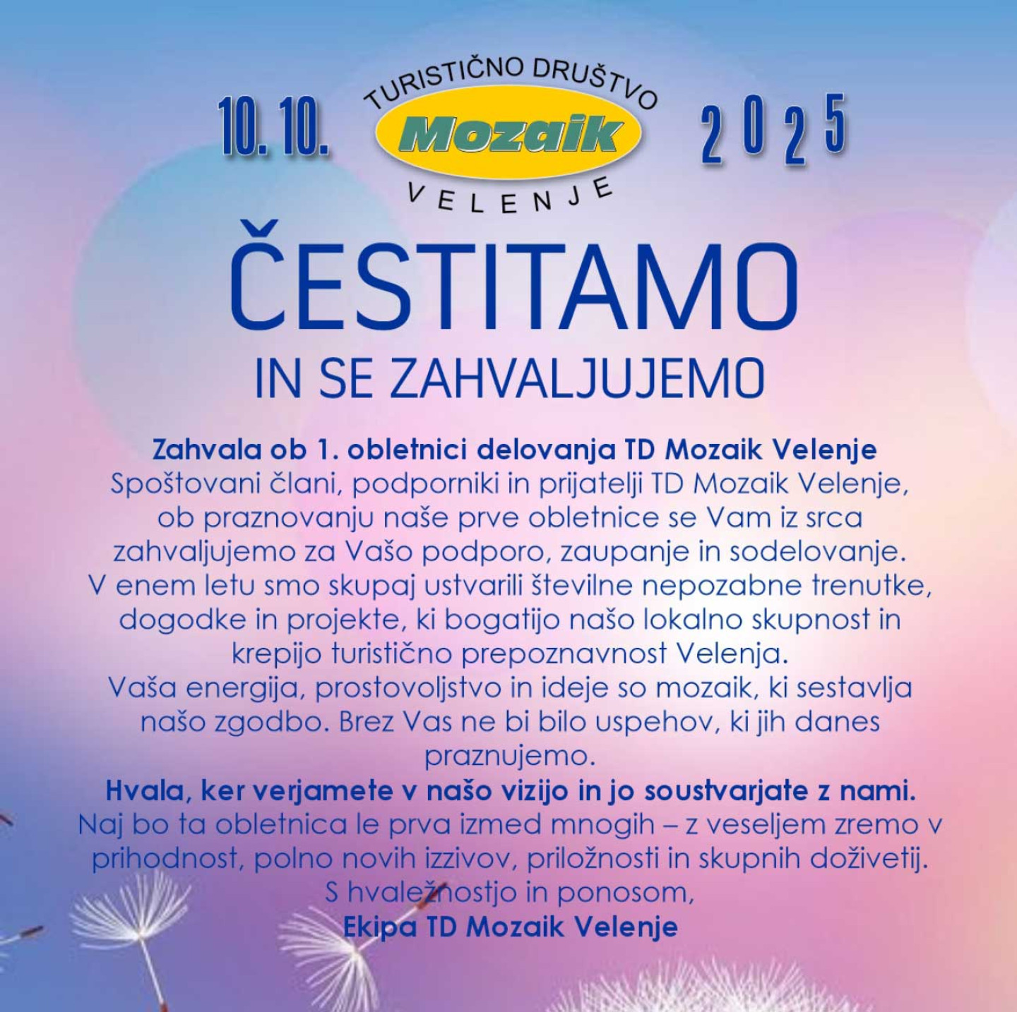 Spoštovani člani, podporniki in prijatelji TD Mozaik Velenje, ob praznovanju naše prve obletnice se Vam iz srca zahvaljujemo za Vašo podporo, zaupanje in sodelovanje.
